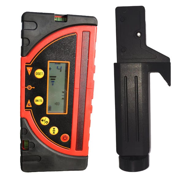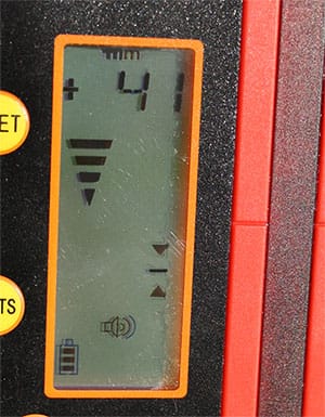 A standard rotating / rotary laser receiver such as the RedBack LR715 indicates when the receiver is either above the level height of the laser plane , below the laser height or exactly on level. ย There are a number of bars that give an rough indication of when you are moving the receiver closer to level, but that is it.