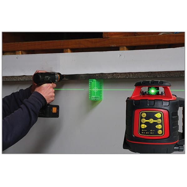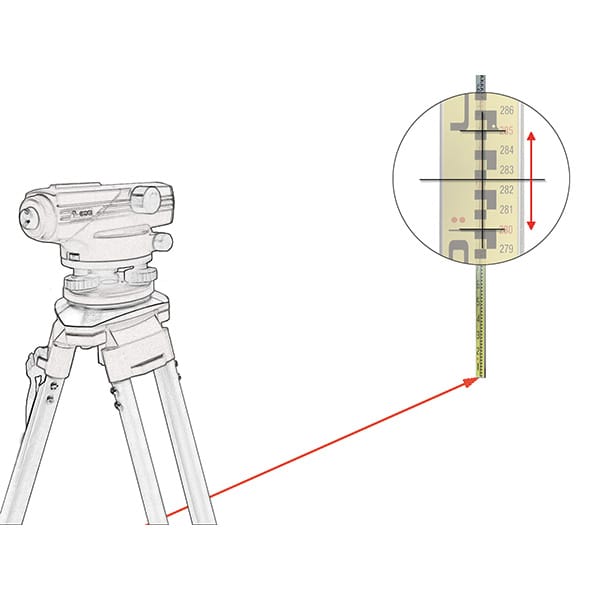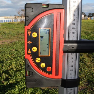 A laser level produces a laser output either as a dot, line or rotating dot. This laser output produces a level reference for the operator to check a site for levelness. The operator walks around around the site and checks the height of the laser against a scaled staff. Indoors the laser line or dot can sometimes be seen on the staff at close range. Outdoors or a greater range the operator will use a laser receiver that is attached to the staff to pick up the laser’s height.